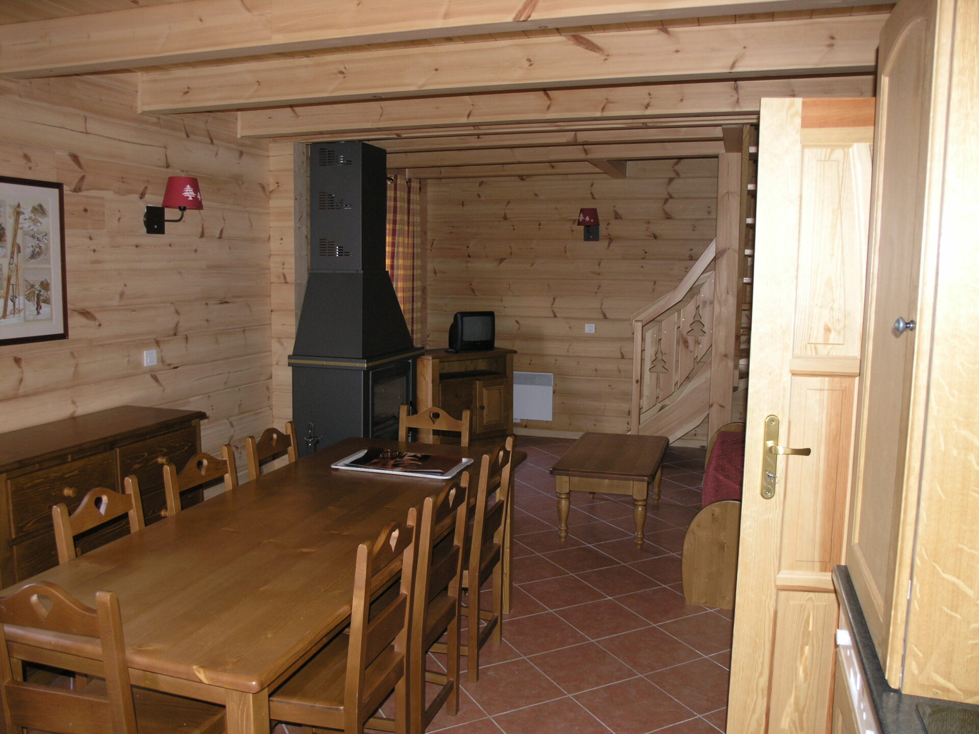 Großes Wohnzimmer mit einem 2 x Schlafsofa, Sesseln, Flachbildfernseher, DVD-Player, Esstisch für 12 Personen, Holzofen.